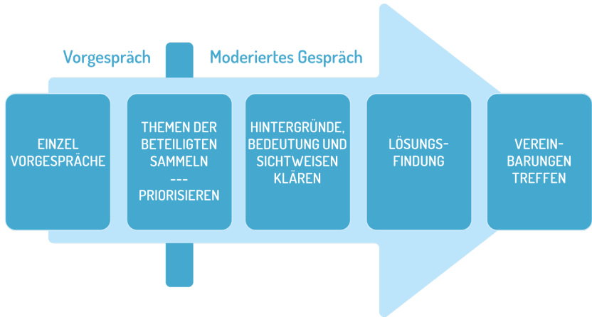 In den Gruppengesprächen versuchen mehrere unterschiedliche Parteien mit meiner Unterstützung Ziele zu definieren. Die soziale Gruppen-Dynamik wird genutzt, um Lösungen zu erreichen.